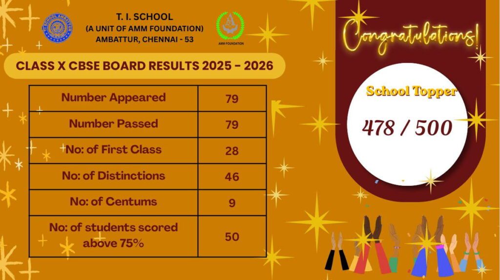 Established in the year 1981, TI School is an offshoot of the philanthropic efforts of the AMM Foundation, envisaged by the visionary Late Shri AMM Murugappa Chettiar alongside five hospitals and 4 other educational institutions. With its humble beginnings, TI School offers best in class education that focuses on holistic student development alongside building socially responsible global citizens, through its well defined mission, quality objectives and measures.