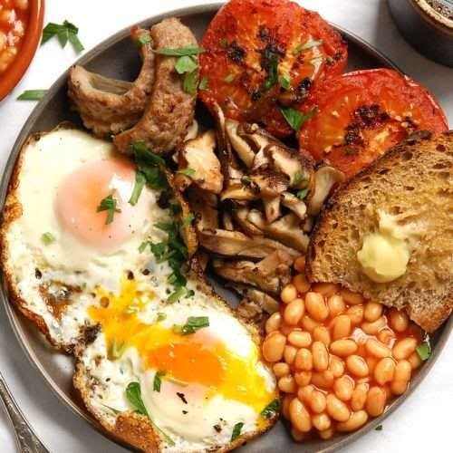 A traditional breakfast that includes a variety of hearty items, such as bacon, sausages, eggs, black pudding (a type of blood sausage), baked beans, grilled tomatoes, mushrooms, and toast. It’s a filling meal that is often enjoyed on weekends.